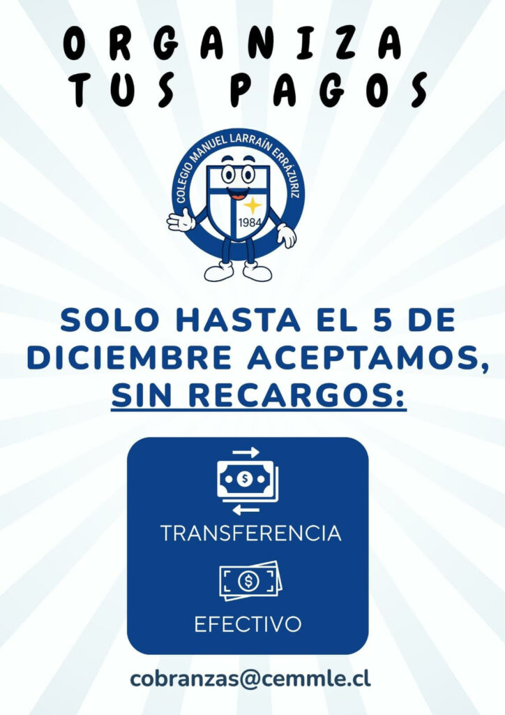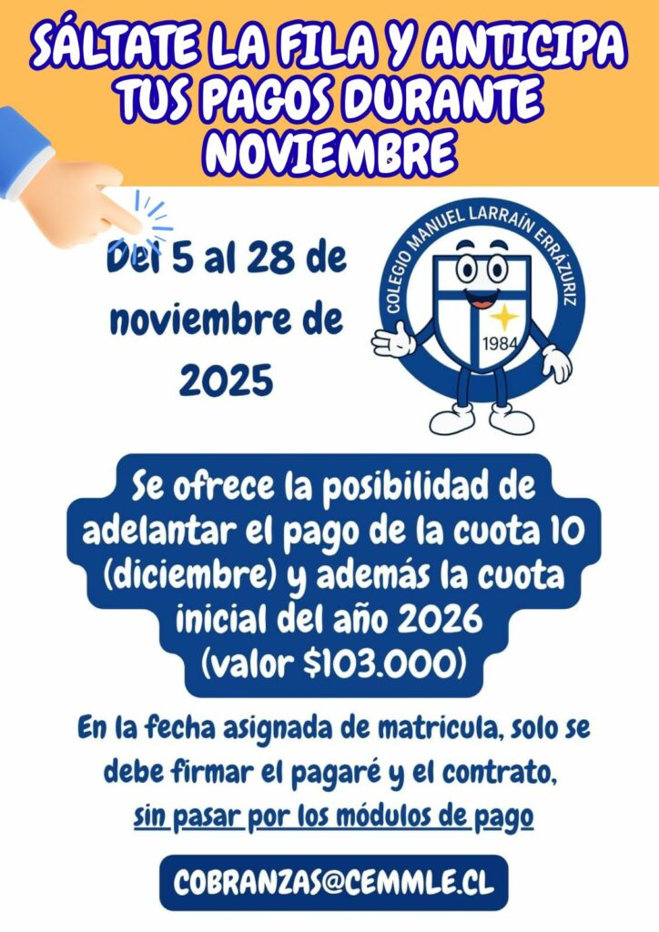 Junto con saludar, les recordamos que el proceso de matrículas para el año académico 2026 está contemplado dentro de los días 09 al 23 de diciembre, para lo cual designamos fechas calendarizadas por curso según detalle que enviaremos en una próxima circular.