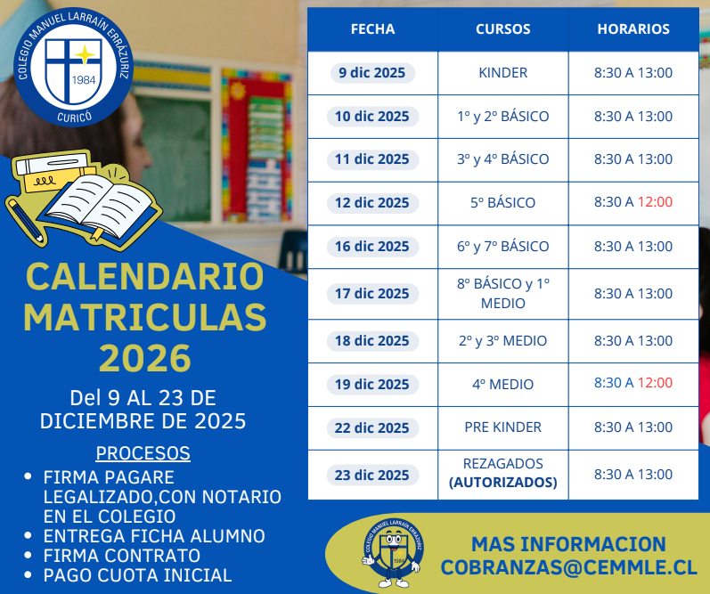 26 Nov 2025 FECHAS IMPORTANTES DE MATRÍCULAS 2026 por admin | publicado en: Centro de Padres, Circulares, Colegio, Finanzas | 0